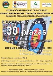 La Federación Andaluza de tiro con arco, en colaboración con la Real Federación Española de Tiro con Arco (RFETA) y el Instituto Andaluz del Deporte, convoca un Curso Monitor de Tiro con Arco Nivel II.